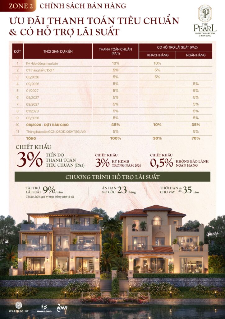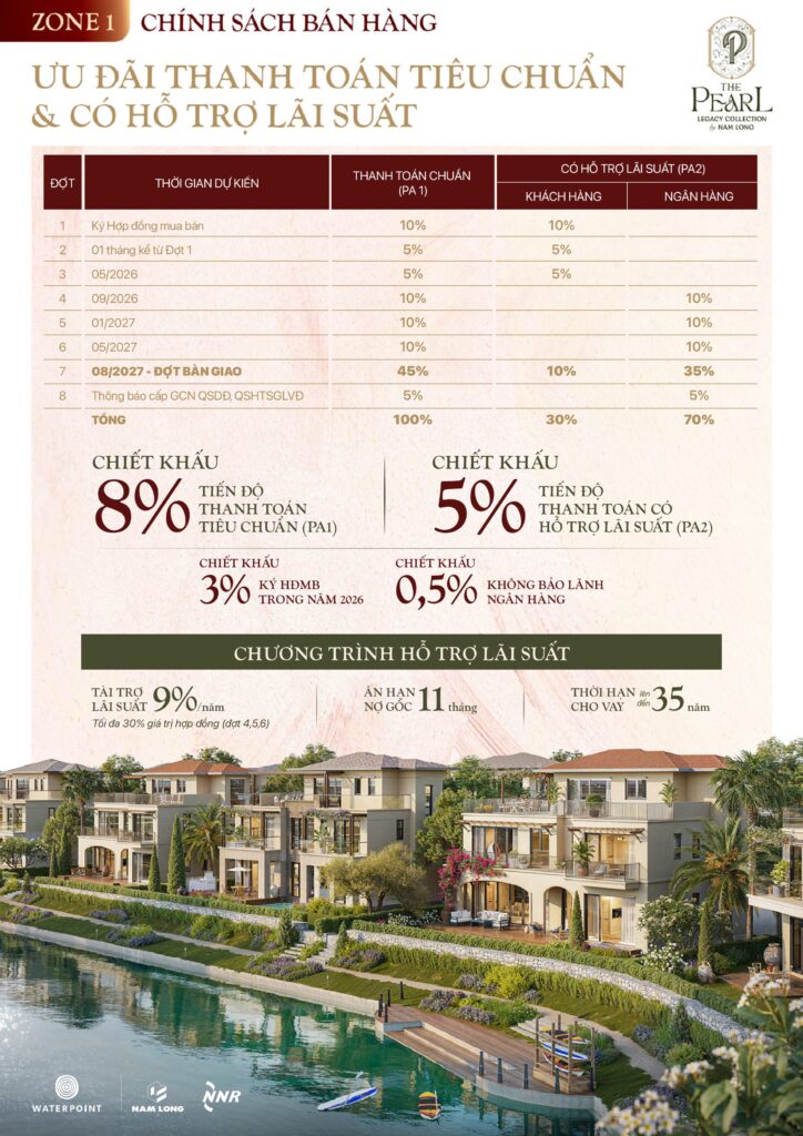 Tiến độ thanh toán chuẩn và chương trình hỗ trợ lãi suất dự án The Pearl Waterpoint Nam Long